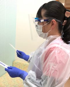 マスクとゴーグルを常に装着し、一処置のたびに使い捨てガウン・手袋の交換、手洗い・手指消毒を念入りに行っています。