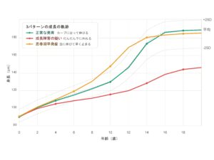 たとえば-1SDのラインに沿って伸び続けているなら、それはその子の「体質」であることが多く、心配いらないケースが大半です。